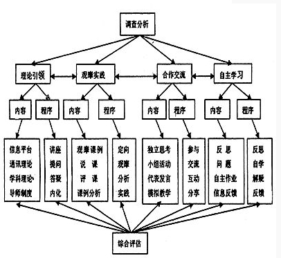 外语教师的培训有别于其他的培训,在培训模式上各位学人也做了很多有益的探索。外语教师的培训要想不流于形式,就应该体现“开放、互动、创新、反思”的设计思路,并应遵循针对性、整合性、参与性、活动性几个原则。也就是说,培训内容紧紧围绕英语新课程有关的问题,引导参培者针对自己在实施新课程过程中可能遇到的困难和困惑进行探讨;理论学习与实践紧密结合,相互参透,通识性培训中的理论应尽可能地使用具体的学科实例进行阐释;培训模式充分体现大家参与的和谐、愉快的学习气氛,培训者与参培者的角色发生变化。培训者由“知识的传授者”成为参与者的“指导者”、“协作者”;传统意义上的“培训对象”、“受训者”成为“参与者”,“参培教师”主动参与培训;参与者不仅进行理论探讨,还要通过大量的实践活动亲身体验新课程的改革思想、内容和措施,从而使自己的思想和行为发生根本的变化。具体的培训模式,应该以科学系统的教育理念和学习理论为依据,结合英语新课程标准,在整合优化不同培训的方式上,针对成人教育的特点,建构融合教学各个层面的微观教学方式,就是采用“互动学习+自我反思式”、“动态督导+策略训练式”、“理论拓展+课题研究式”为一体的、适应时代要求的多元化外语教师教育方式,从而使受教育者在动态的知识建构中提高教学理论水平,培养自身的专业素质和自主发展能力。也可以采用由王枫杯等设计的相互独立又彼此联系的,在“调查分析”模块的基础上,由“理论引领”、“观摩实践”、“合作交流”、“自主学习”这四大“过程板块”和一个训后“综合评价”板块组成的教师培训模式。如图1所示;