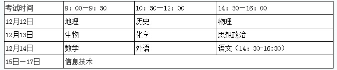 本次普通高中学业水平考试将于2014年12月12日—17日进行。具体考试时间安排如下: