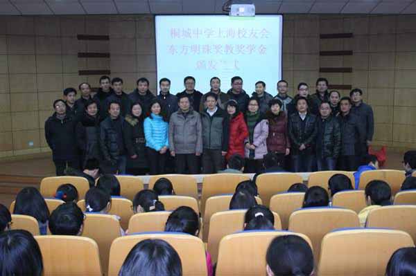 2014年1月21日晚,东方明珠高考奖颁发仪式在我校科技大楼多功能报告厅举行。我校江喆副校长、上海校友会崔波秘书长出席颁奖仪式,并共同为获奖师生颁奖。东方明珠高考奖是桐城中学上海校友会为奖励高考成绩突出的师生而设立的奖项,是上海校友会支持母校发展的重要项目之一。