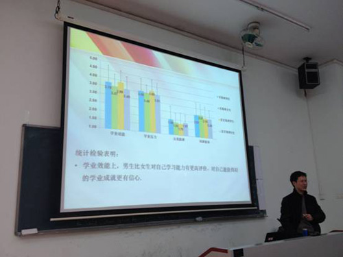 反馈分为两个部分,第一部分由邓博士对被测试同学的任课教师进行结果反馈,第二部分则是对被测试的同学们进行反馈。邓博士详细地介绍了测试的内容以及对教育教学工作的重要指导意义,并将测试数据分析结果呈现给大家。他对学生在学习动机、学习方法、影响因素等方面的测试结果做了详尽的阐述,并根据我校区别于其他学校的数据专门做了针对性的分析和教育方法指导。最后,霍教授还对听讲的老师们再次强调了科学测试的数据结果对我校拔尖创新人才培养的重要意义,希望大家能够学会运用数据,找到规律,科学育人。
