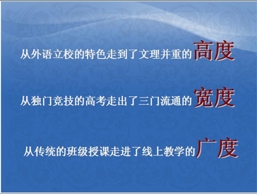 李校长以理念引领、制度创新、行为提升、课程建设、环境优化五个部分来分享我们2013年的收获;鼓励全体教职员工在新的一年中,继续以持续学习的才气、求真务实的底气、攻坚克难的勇气、为民奋进的锐气,带领全体外校人去实现我们的梦想。