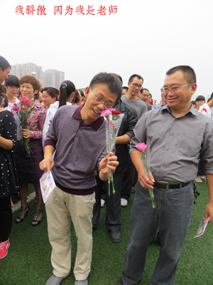 九月的青龙场,秋风送爽,丹桂飘香。今秋全面进驻青龙场的成都市实验中学洋溢着浓郁的节日气氛。上午九点半,全校两千多名师生齐聚操场,共同庆祝第二十九个教师节。活动由校团委、学生会组织。活动中,高三年级的学生朗诵了他们自己创作的诗歌《致老师》,全校39个班的学生代表向所有的教职工赠送了鲜花和卡片,全体同学齐唱歌曲《每当我走过老师的窗前》,掌声、歌声、鲜花、贺卡......同学们用最纯真的语言表达了对老师的敬意。高亢嘹亮的学生集体宣誓,向国旗、向全校老师表达了他们对新学期、新目标、新征程的无限信心,整齐的歌声、嘹亮而庄严的誓言把本次活动推向了高潮。教师代表李红梅主任发表了《致实验中学学生的一封信》,学校党总支书记、校长刘云同志用精炼的语言概述了学校的总体发展思路,展现了成都实验美丽的梦境,向全校师生发出了“立足青龙,心系未来,放眼世界,为成就明天的辉煌而奋发努力!”的号召,对同学们提出了殷切希望:希望同学们要遵规守纪、热爱学习、品学兼优,要虚心接受老师的教诲或指导,认真完成或落实老师布置的学习要求,以实际行动感恩教师,以优异的成绩回报老师!