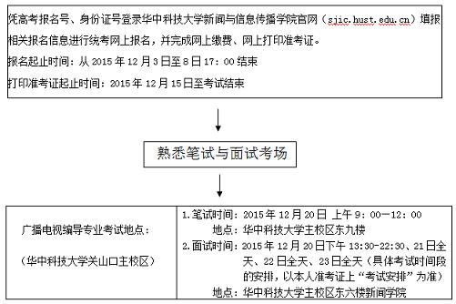 已在高考网报时选报了戏剧与影视学类广播电视编导专业的考生,请于2015年12月3日至12月8日17:00,凭高考报名号及身份证号登录华中科技大学新闻与信息传播学院官网(sjic.hust.edu.cn)填报相关报名信息进行网上报名并完成网上缴费。请考生务必在规定时间内,合理安排时间进行网上报名和网上缴费,以免错过网报时间。考试流程如下: