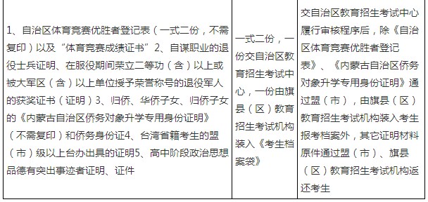 (二)旗县(区)教育招生考试机构将本旗县区享受增加分数投档和降低分数投档考生需要上交的证明材料于4月30日前集中报盟(市)教育招生考试机构,盟(市)教育招生考试机构将本盟(市)需要上交的证明材料于5月10日前集中报自治区教育招生考试中心(逾期不予受理),由自治区教育招生考试中心送交相关主管部门审核认定,审核认定后的原始证明材料通过盟(市)教育招生考试机构逐级返还考生本人。