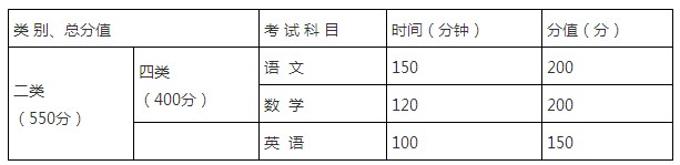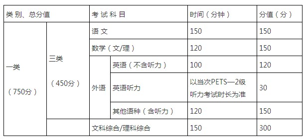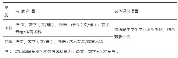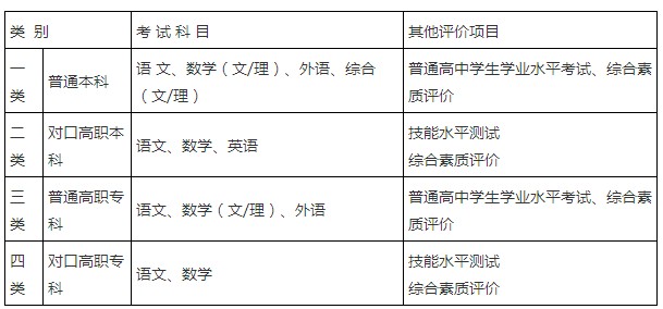 普通本科类实施语文、数学(文/理)、外语+综合(文/理)科目组合;对口高职本科类实施语文、数学、英语科目组合;普通高职专科类实施语文、数学(文/理)、外语科目组合;对口高职专科类实施语文、数学科目组合。