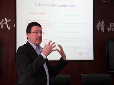 Steve Cook为全体英语教师做了主题为“how to become better teachers”的讲座,他具有丰富的学识、谦虚的态度,他热情地为大家讲解关于教学理念他的一些思考。例如,他谈到学生思考能力的重要性,要先有思考才有表达;学生学习是个积极主动的过程,教师要帮助学生正确评价自己,鼓励学生不断上进,要相信每个学生都有潜力,要充分发挥他们的潜能。同时,他还强调课堂教学形式要多样有趣,让学生参与到学习活动中来。