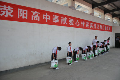 2012年5月21日,荥阳高中在操场上举行了内容丰富的“爱心奉献真情传递”启动仪式,除全校师生外,我们还请来了特殊的客人——荥阳市特殊教育学校的部分师生。在启动仪式上,荥阳市特殊教育学校赵利峰校长做了专题讲话,学生们表演了诗朗诵和“感恩的心”手语操,让我们了解了聋哑孩子生活遭受的挫折,更让我们看到他们积极向上顽强拼搏的可贵的精神品质。崔校长最后勉励全校师生胸怀大爱积极向上地学习和工作。